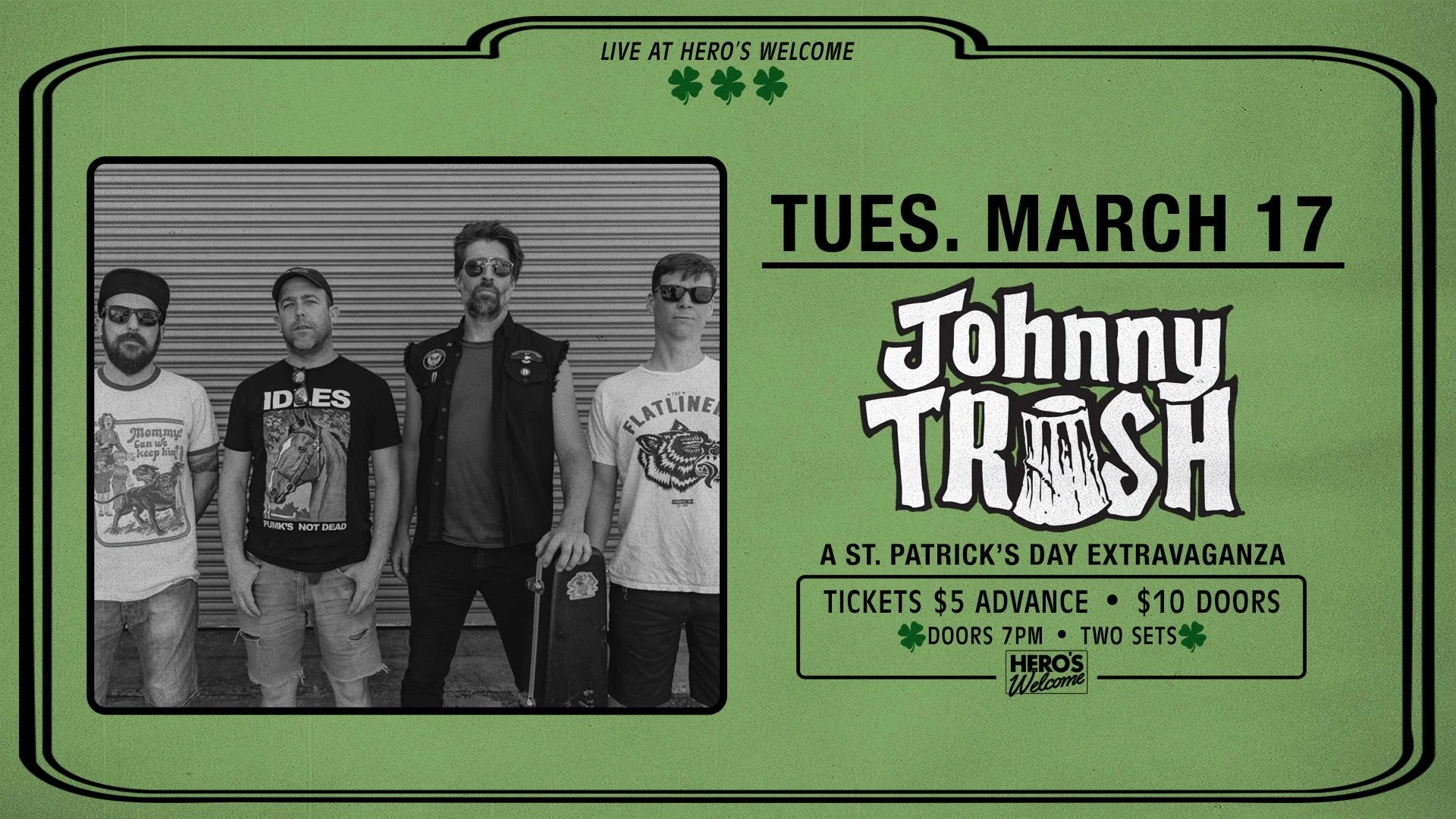 Join your pals at Hero’s for a St. Patrick’s Day Extravaganza featuring JOHNNY TRASH! There will be music! There will be dancing! There will be Guinness! And Jameson!